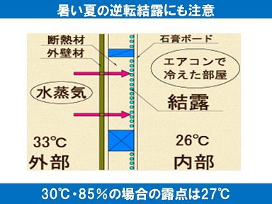 しかし、昨今では、温暖化やエアコンなどの普及にもあり、壁内部と室内の温度差が広がり、夏場に発生する逆転結露の問題が、クローズアップされるようになったのです。