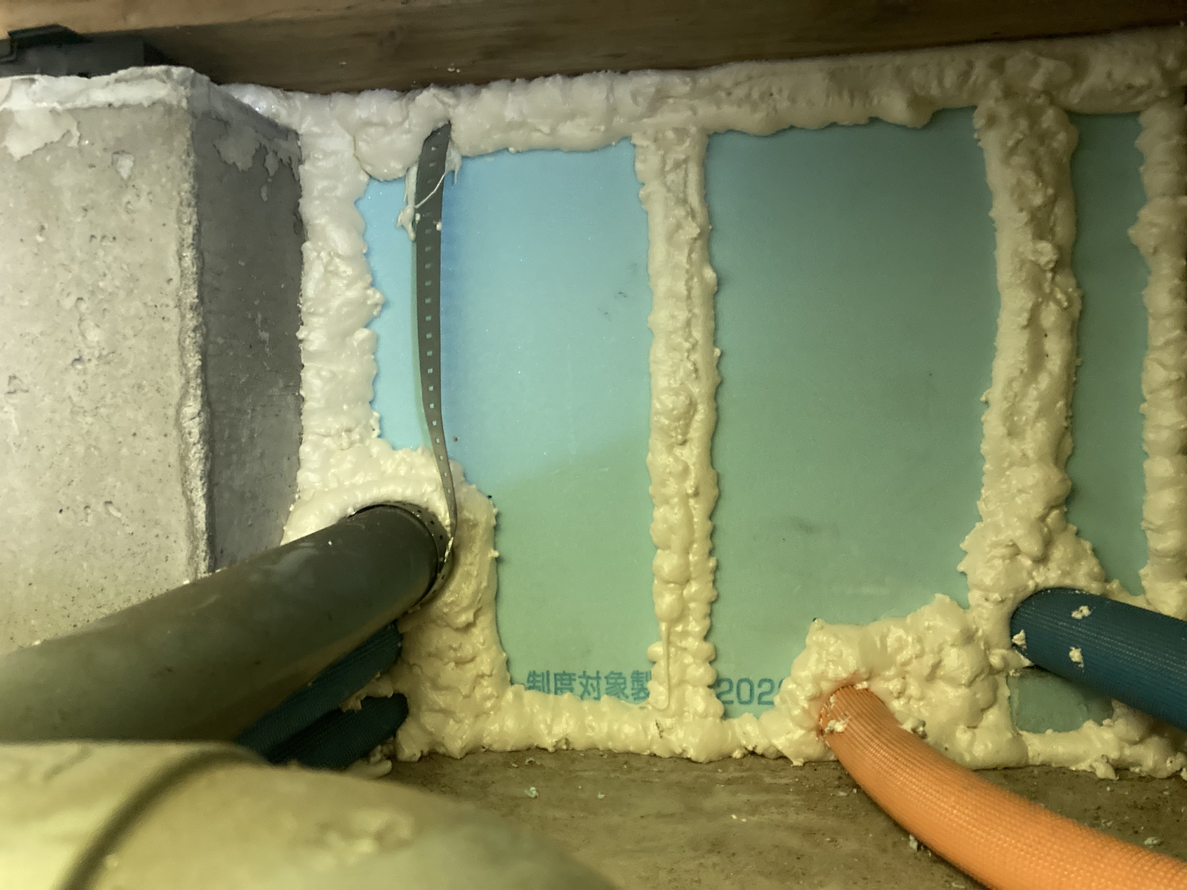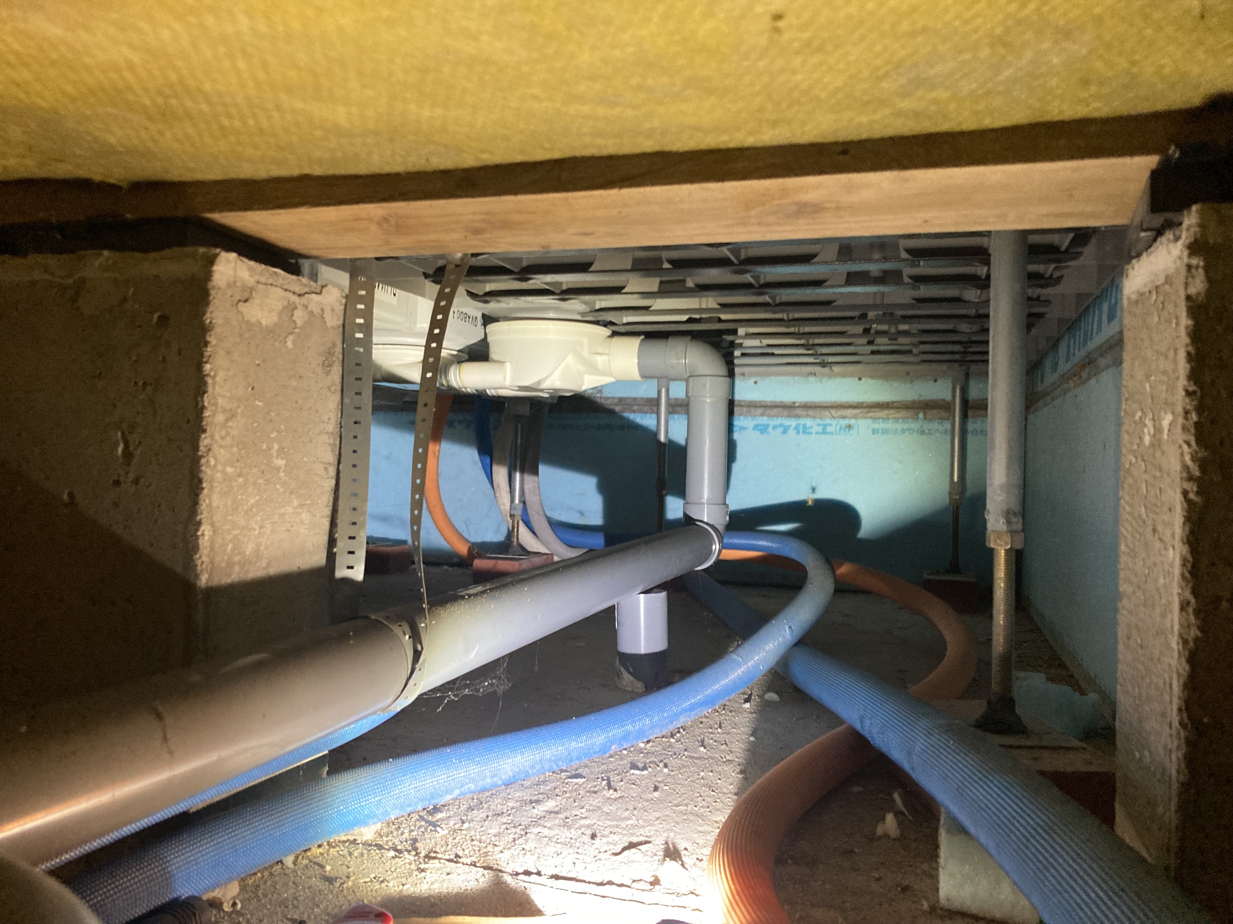 脱衣所、お風呂の下は給排水が集中するところで、特にお風呂の下は基礎の内側に断熱材を入れて、ユニットバスの床が冷たくならないようにしていますが、この配管を通すのにどうしてもその断熱を切り欠いて通す必要があります。本来そこもちゃんと断熱でふさぐ必要がありますが、実際見てみると下のように外気がツーツーに流れ込むというのもざらにあります。(こうなると水色の断熱材は全くの意味をなさない)