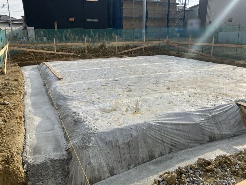 防湿フィルム外周には捨てコンクリートが打設されました。引き続き鉄筋組が始まります。