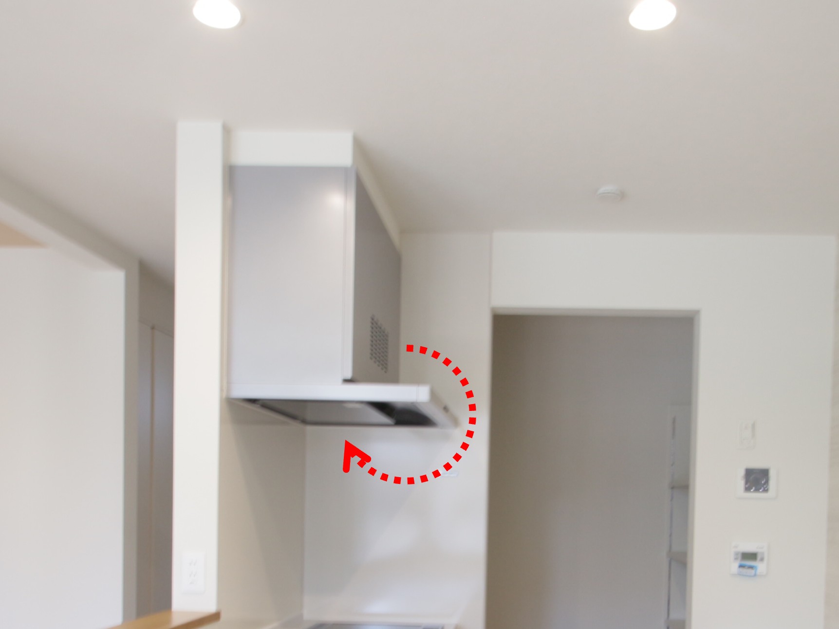 もちろん空気を入れるのは部屋の窓を開けるわけではなく、排気と連動してレンジフード全面のスリットから出てきて、下部から回収される仕組みなので、そこだでショートサーキットとなります(写真参照)