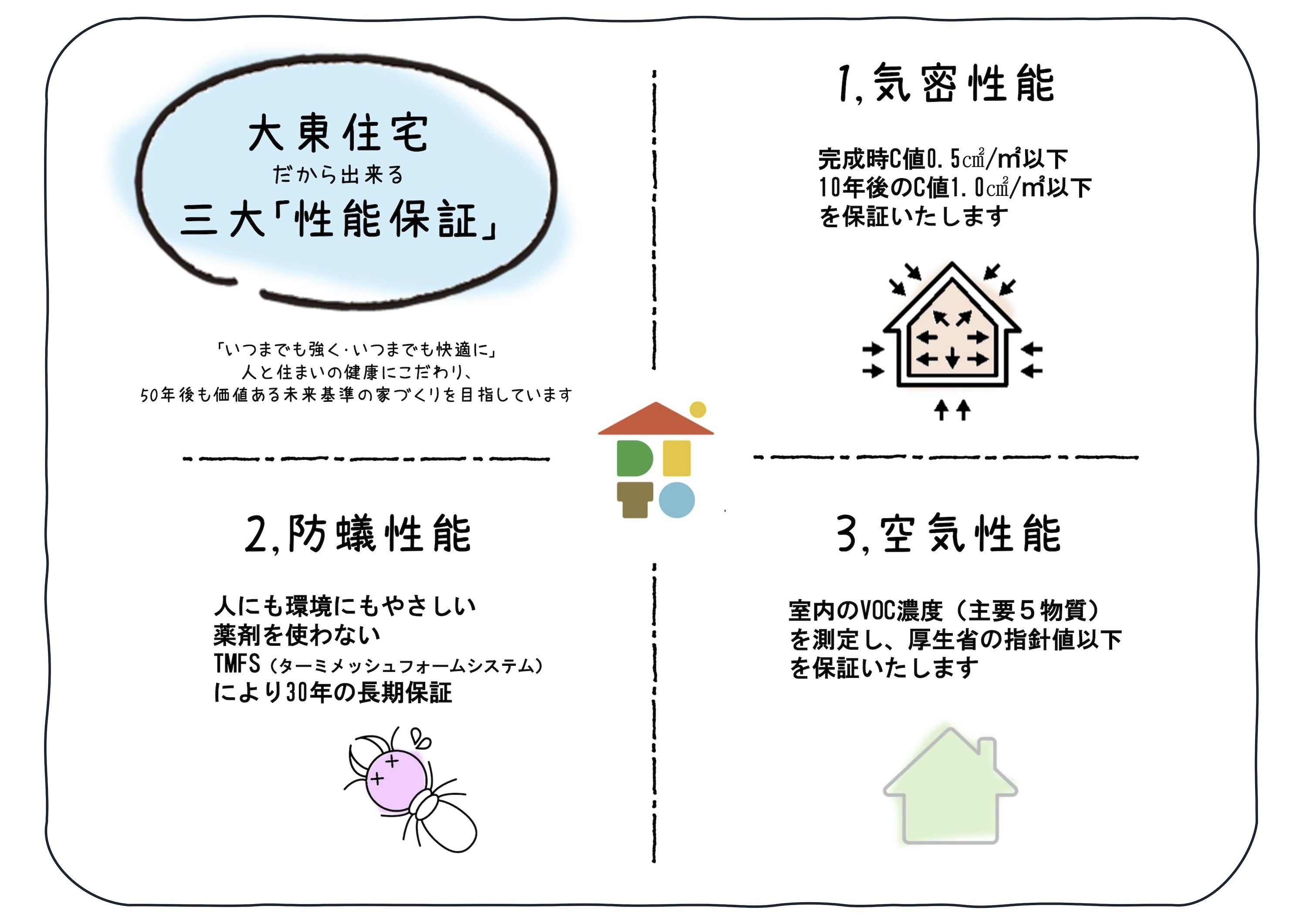 大東住宅では、気密測定技術者の指導のもと気密測定検査を2回(中間時・完成時)実施し、完成時C値 0.5以下を保証いたします