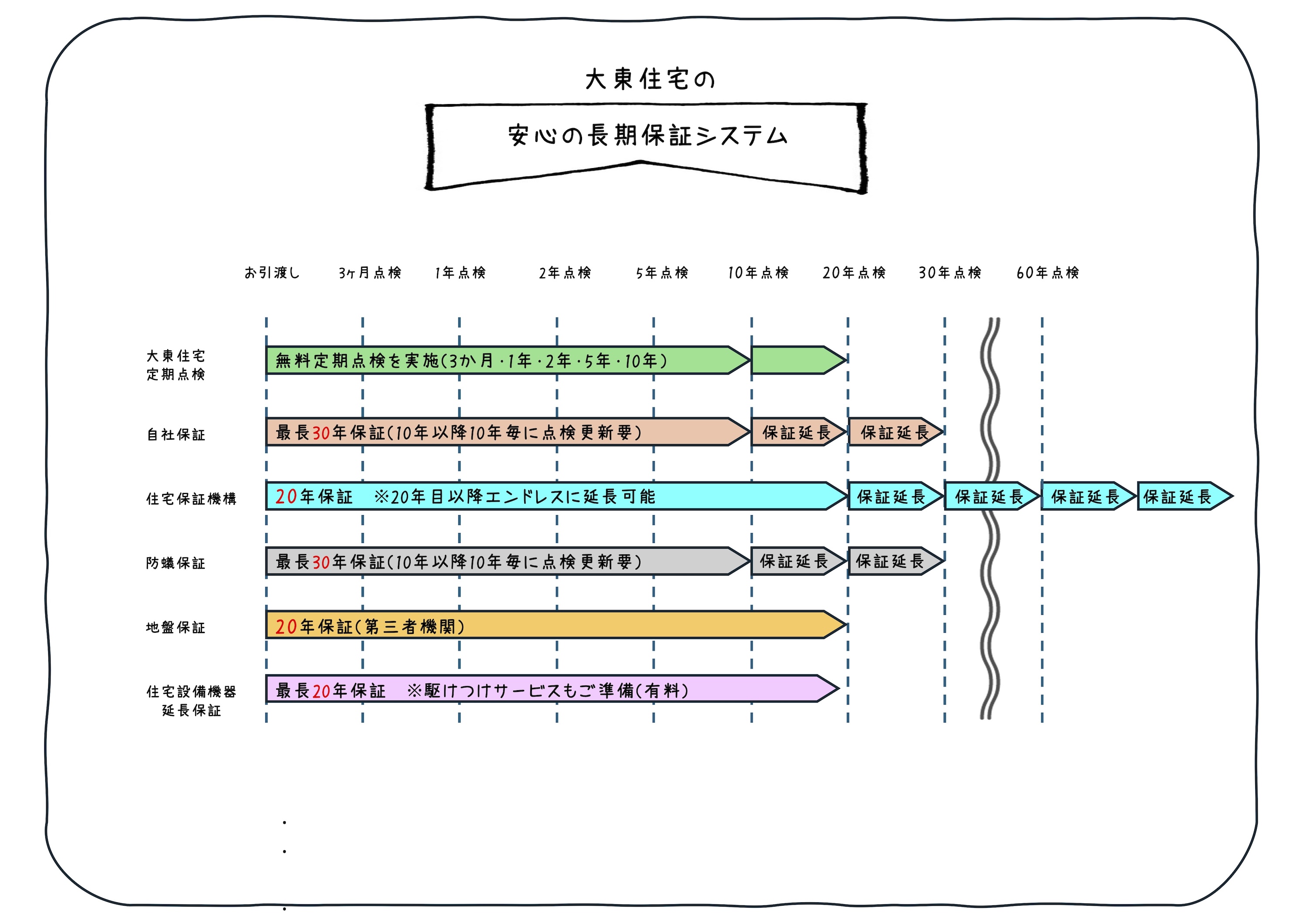 お引き渡し後の定期点検をはじめ、ご家族がずっと快適に、安心して暮らせる万全の体制を整えています。引渡し10年目、20年目の無料点検時に当社が必要と認めた有料メンテナンス工事を実施していただきます。(当社、施工による。)主たる建物の基礎、軸組、床、壁及び屋根の構造耐力性能につき長期保証いたします。