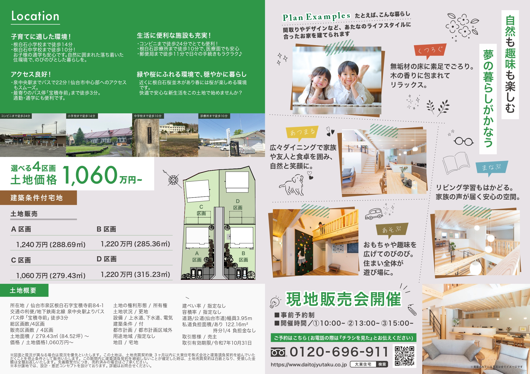 仙台市泉区根白石にて、建築条件付き宅地 現地販売会を開催いたします。