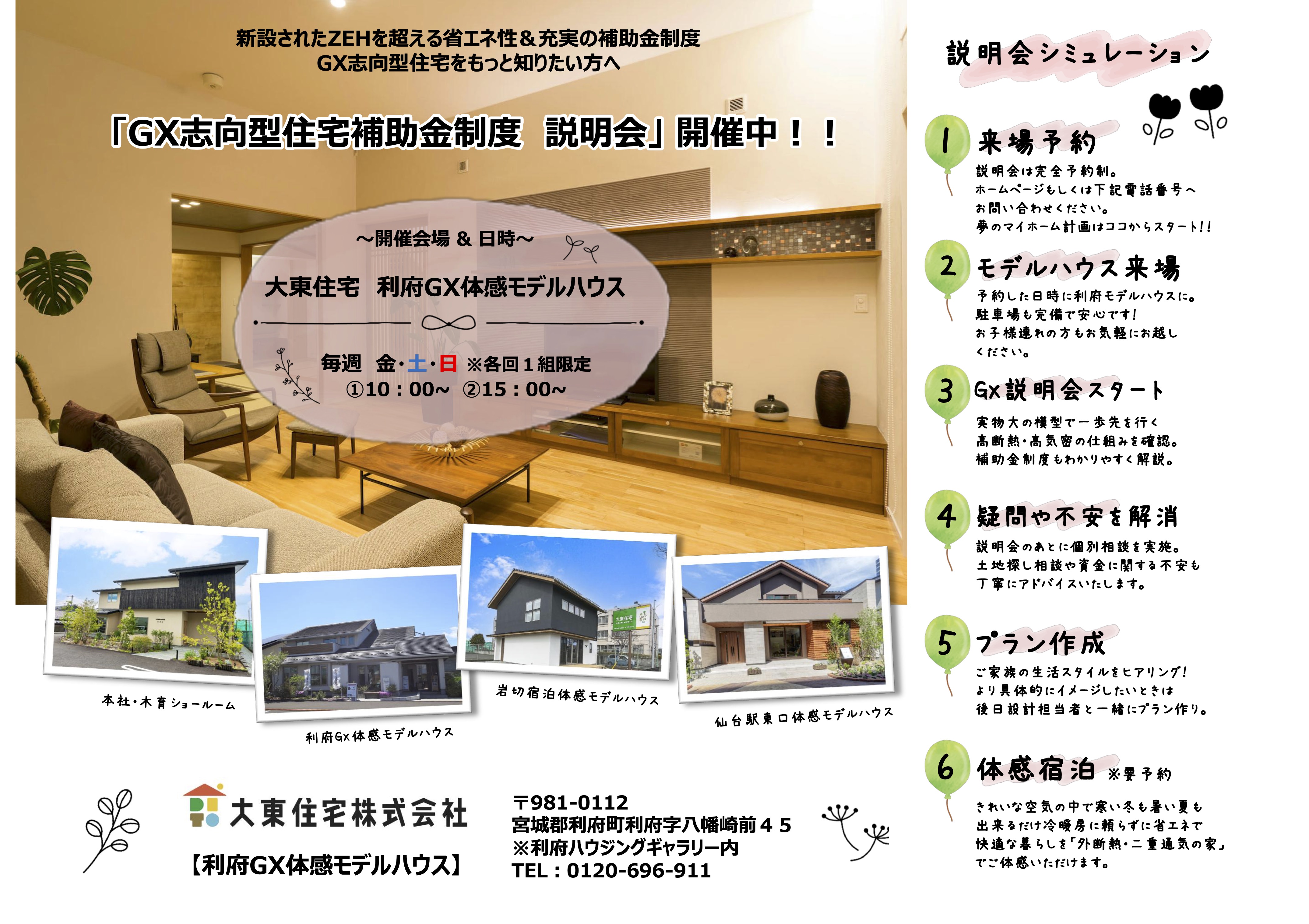 大東住宅 利府GX体感モデルハウスにて「GX志向型住宅補助金 説明会」を開催しています。